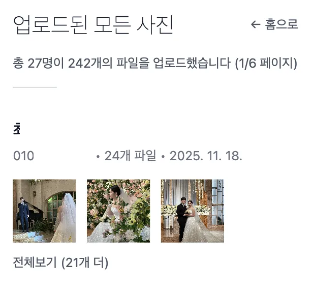 그래도 결혼 준비로 정신없는 와중에 원하는 기능을 다 구현할 수 있었고, 실제로 지인들이 방명록 남기고 사진 올리는 걸 보니 뿌듯했다.